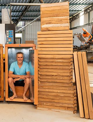 A caixa mede, internamente, 120x56x71cm. Em teoria sim, já se venderam caixas a clientes com 1,95m! Mas a questão não está, propriamente, na altura da pessoa, mas na altura do tronco e no assento a usar. Por exemplo, duas pessoas da mesma altura, uma pode tocar com o cabelo no teto da caixa e outra pode ficar a 6cm! Sentado, medindo a altura do tronco, vai determinar a altura do banco para si. Há também quem prefira sentar-se no chão da caixa, com uma manta orgónica ou almofada, usufruindo da energia do painel da base.